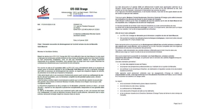 COURRIER : Demande renouvelée de déménagement de l’activité tertiaire du site de Marseille Saint-Mauront