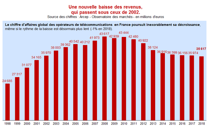 Les perspectives pour 2019 ne sont pas vraiment encourageantes. Ainsi, au 1er trimestre, pour la première fois depuis deux ans, Orange a publié un chiffre d’affaires en baisse de 1,8%, tout en gagnant des abonnés sur le fixe comme sur le mobile. Ses dirigeants ont fustigé la « spécificité dans laquelle certains opérateurs se sont engagés, si ce n'est enfermés, qui font du volume au détriment de la valeur ».